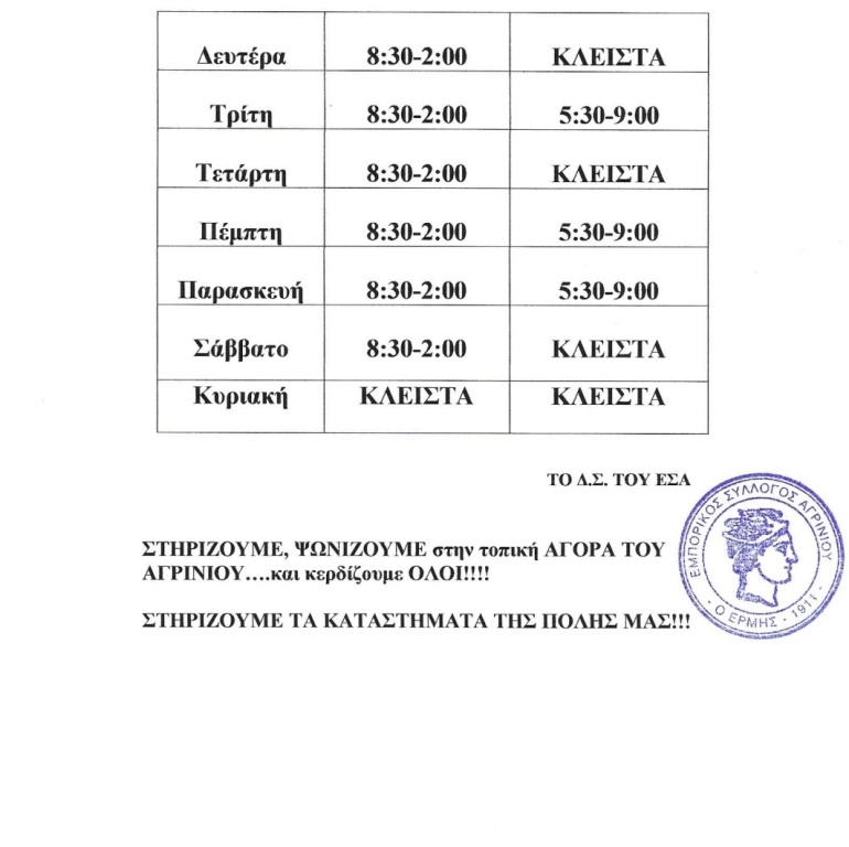 Ο Εμπορικός Σύλλογος Αγρινίου ανακοινώνει το νέο ωράριο λειτουργίας των καταστημάτων της πόλης από 1η Σεπτεμβρίου