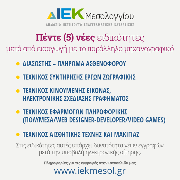 Μετά την ανακοίνωση των αποτελεσμάτων εισαγωγής νέων σπουδαστών στα Δημόσια ΙΕΚ, οι οποίοι υπέβαλλαν παράλληλο μηχανογραφικό, στο ΔΙΕΚ Μεσολογγίου δημιουργούνται πέντε (5) νέες ειδικότητες.