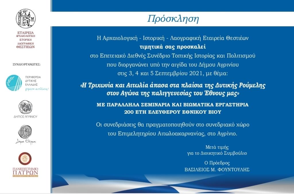Η Αρχαιολογική - Ιστορική - Λαογραφική Εταιρεία Θεστιέων σας προσκαλεί στο Επετειακό Διεθνές Συνέδριο Τοπικής Ιστορίας και Πολιτισμού που διοργανώνει υπό την αιγίδα του Δήμου Αγρινίου στις 3, 4 και 5 Σεπτεμβρίου 2021 με θέμα: «Η Τριχωνία και Αιτωλία άπασα στα πλαίσια της Δυτικής Ρούμελης στον Αγώνα της παλιγγενεσίας του Έθνους μας»