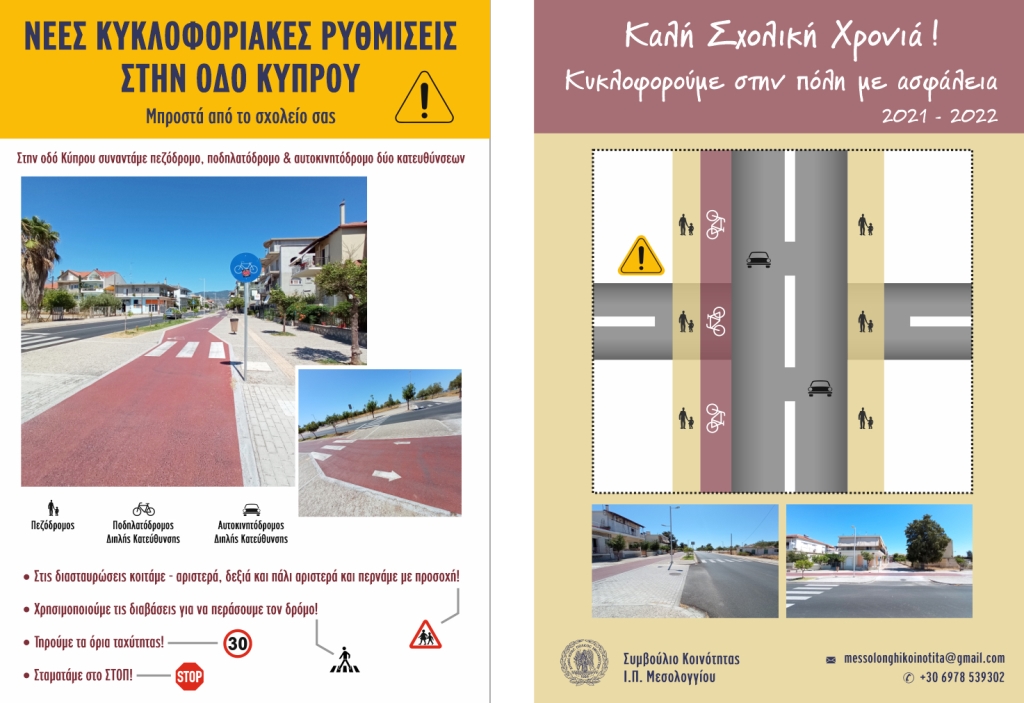 Εξαιτίας των νέων ρυθμίσεων σε μια από τις βασικές οδούς της πόλης του Μεσολογγίου, την ΟΔΟ ΚΥΠΡΟΥ, καλούμε μαθητές, εκπαιδευτικούς, γονείς, να προσέχουν ιδιαίτερα τις διασταυρώσεις σε όλο το μήκος της οδού. Πλέον υπάρχει ΠΟΔΗΛΑΤΟΔΡΟΜΟΣ διπλής κατεύθυνσης και ΠΕΖΟΔΡΟΜΟΣ από την πλευρά των σχολείων και ο δρόμος συνεχίζει να είναι διπλής κατεύθυνσης.