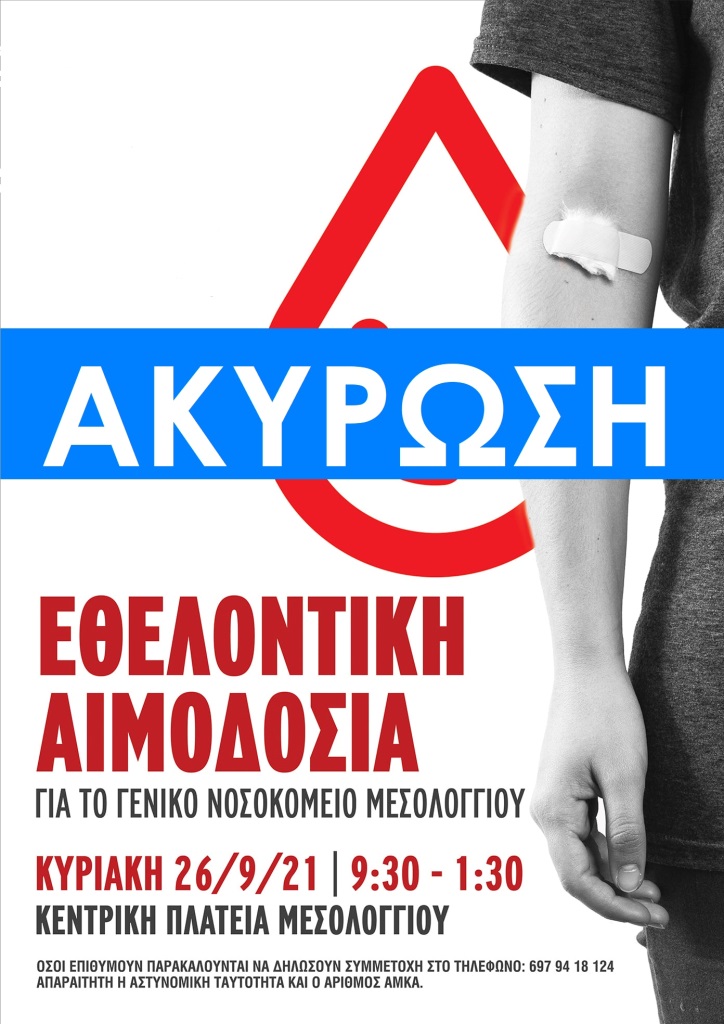 Δυστυχώς η προγραμματισμένη εθελοντική αιμοδοσία για την Κυριακή 26 Σεπτεμβρίου 2021 στην κεντρική πλατεία Μεσολογγίου ματαιώνεται εξαιτίας μετακίνησης ιατρού του τμήματος Αιμοδοσίας Μεσολογγίου στο Νοσοκομείο Αγρινίου. Το γεγονός αυτό, εκτός των άλλων, καθιστά αδύνατες τις εξωτερικές αιμοληψίες του τμήματος.