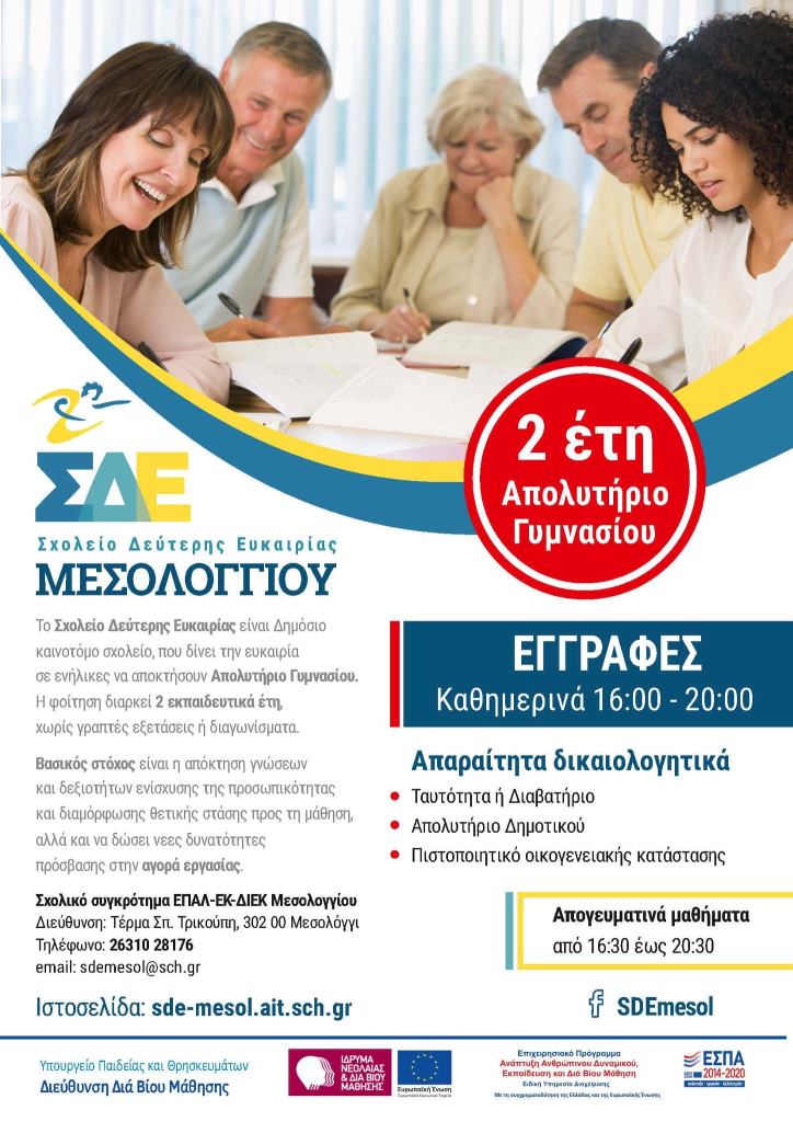 Τα Σχολεία Δεύτερης Ευκαιρίας είναι δημόσια, καινοτόμα σχολεία του ελληνικού εκπαιδευτικού συστήματος, τα οποία απευθύνονται αποκλειστικά σε ενήλικες που ενδιαφέρονται να λάβουν τον απολυτήριο τίτλο του γυμνασίου.