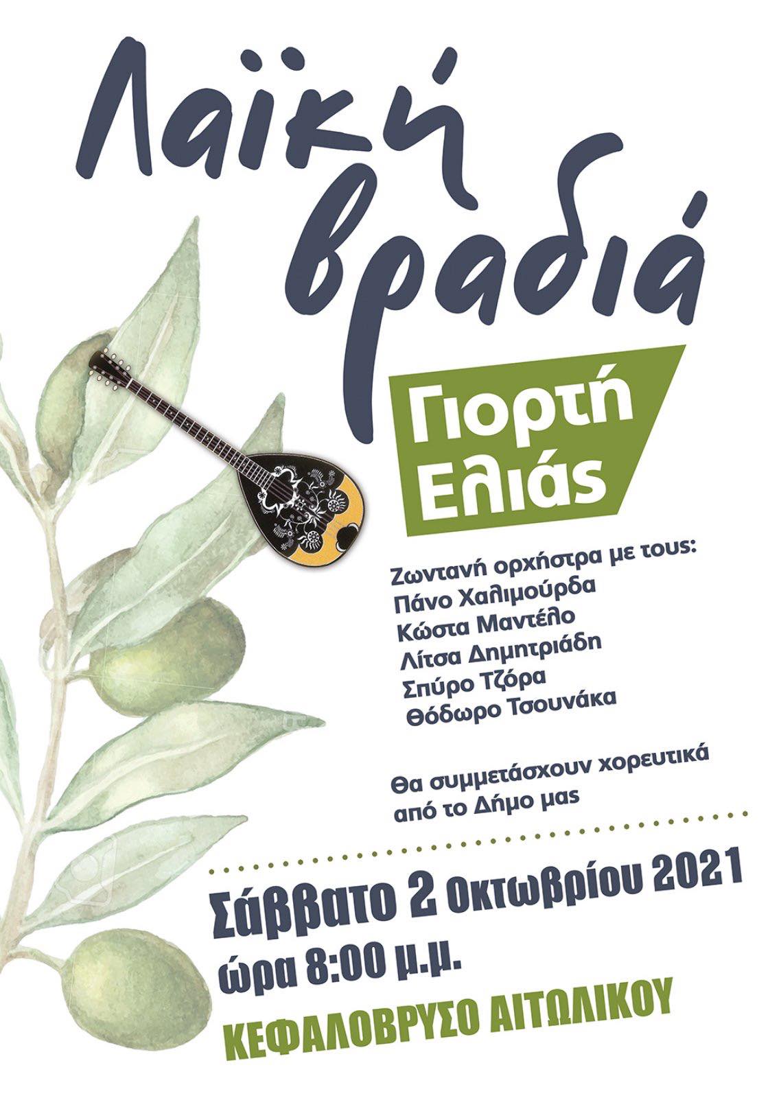 Στο ξεκίνημα της νέας εσοδείας θα γιορτάσουμε εδώ στο Δήμο Ι.Π. Μεσολογγίου, ο οποίος είναι ο μεγαλύτερος σε όγκο παραγωγής ελιάς Καλαμών στη χώρα μας, οργανώνοντας για τρίτη συνεχόμενη χρονιά, το Σάββατο 2 Οκτωβρίου 2021 τη «3 η Γιορτή Ελιάς» στο Κεφαλόβρυσο Αιτωλικού.