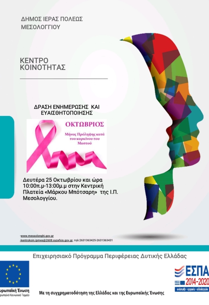 Στο πλαίσιο αυτό και με αφορμή την παγκόσμια ημέρα κατά του καρκίνου του μαστού, το Κέντρο Κοινότητας με Παράρτημα Ρομά του Αυτοτελούς Τμήματος Κοινωνικής Προστασίας, Παιδείας και Πολιτισμού Δήμου Ι.Π. Μεσολογγίου θα πραγματοποιήσει