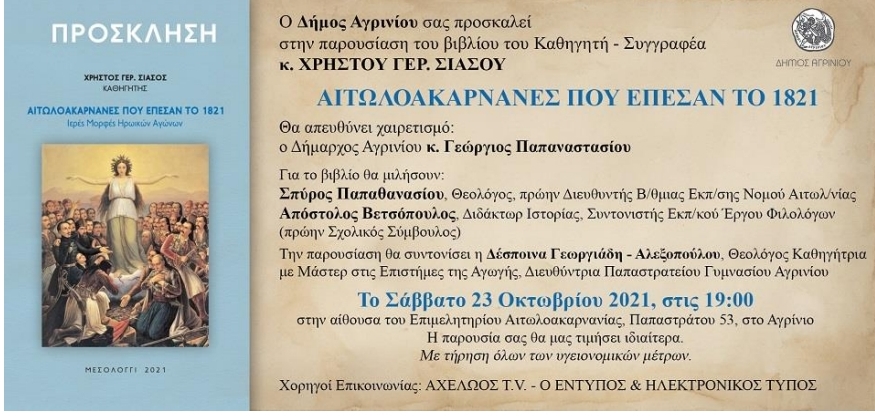 Ο Δήμος Αγρινίου σας προσκαλεί, στην παρουσίαση του βιβλίου «Αιτωλοακαρνάνες που έπεσαν το 1821» του καθηγητή – συγγραφέα Χρήστου Γερ. Σιάσου, στην αίθουσα του Επιμελητηρίου Αιτωλοακαρνανίας, το Σάββατο 23 Οκτωβρίου και ώρα 19:00.