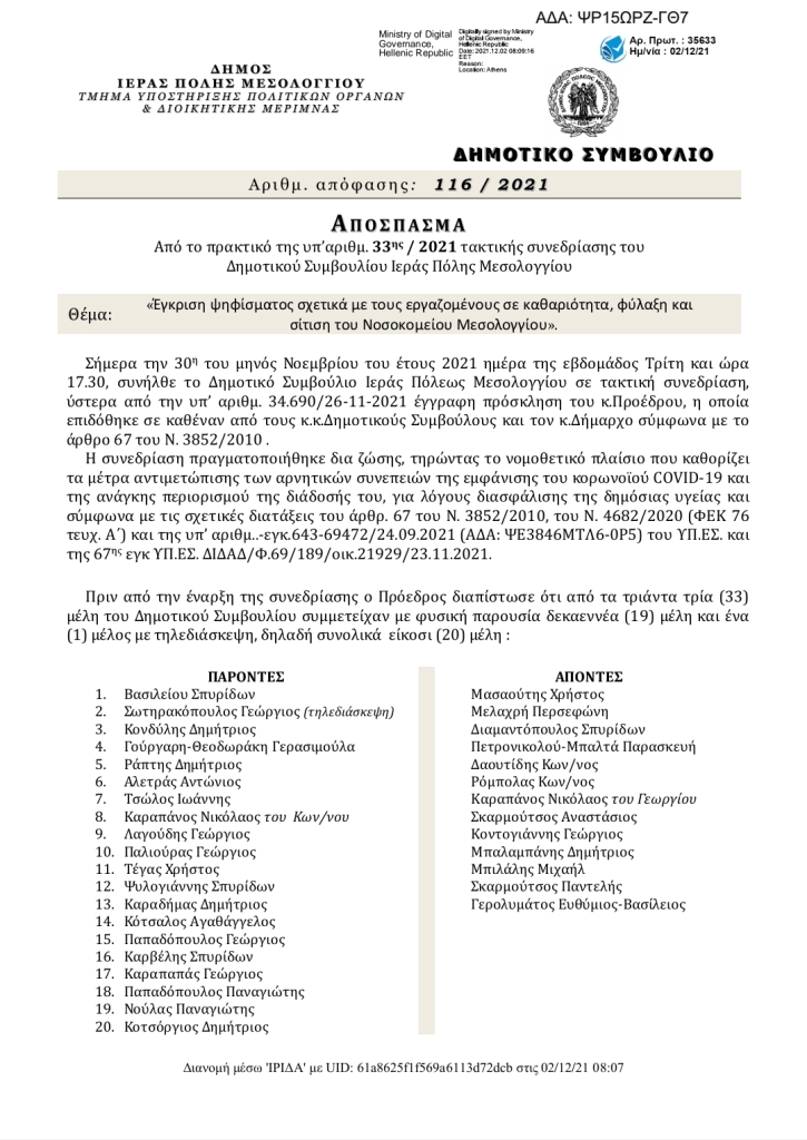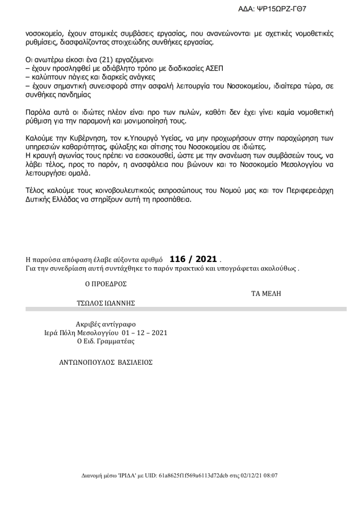 Το Δημοτικό Συμβούλιο του Δήμου Ι.Π. Μεσολογγίου, κατά την 33η Τακτική του Συνεδρίαση την 30-11-2021, μετά από πρότασή μου, έλαβε ΟΜΟΦΩΝΗ απόφαση υιοθετώντας σχετικό ψήφισμα, για την παραμονή – μονιμοποίηση των εργαζομένων στην καθαριότητα, φύλαξη και σίτιση στο Νοσοκομείο Μεσολογγίου.