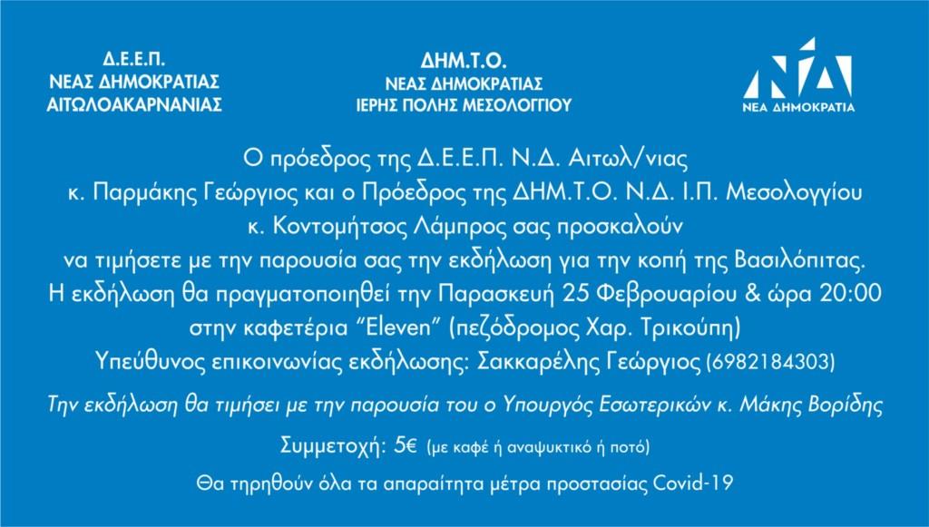 Πρόσκληση στην κοπή πίτας της Δ.Ε.Ε.Π. Ν.Δ Αιτωλοακαρνανίας από τον πρόεδρο κ. Παρμάκη Γεώργιο και της ΔΗΜ. Τ.Ο. Ν.Δ. Ι.Π. Μεσολογγίου από τον πρόεδρο κ. Κοντομήτσο Λάμπρο υπό την παρουσία του υπουργού Εσωτερικών κ. Βορίδη Μάκη.