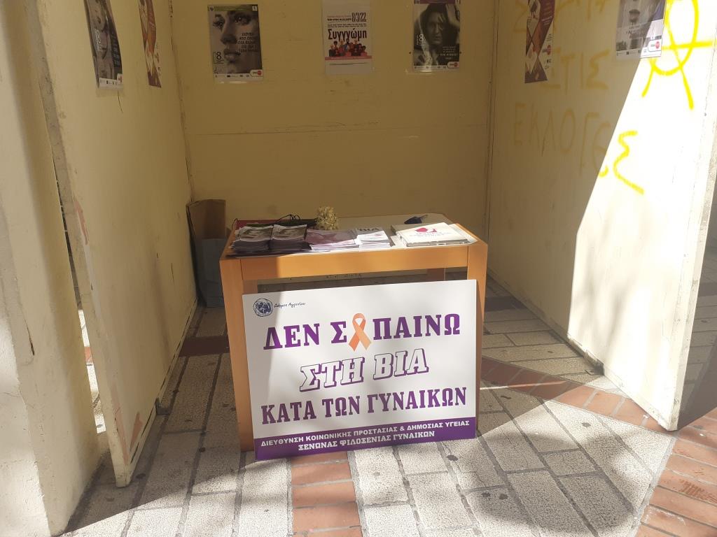 Ενημερωτικό υλικό σχετικά με τις δράσεις του Ξενώνα Φιλοξενίας Γυναικών του Δήμου Αγρινίου με αφορμή της Παγκόσμια Ημέρα της Γυναίκας μοιράζουν στελέχη της δομής στον πεζόδρομο της Χ. Τρικούπη (πλησίον του Δημαρχείου Αγρινίου) .