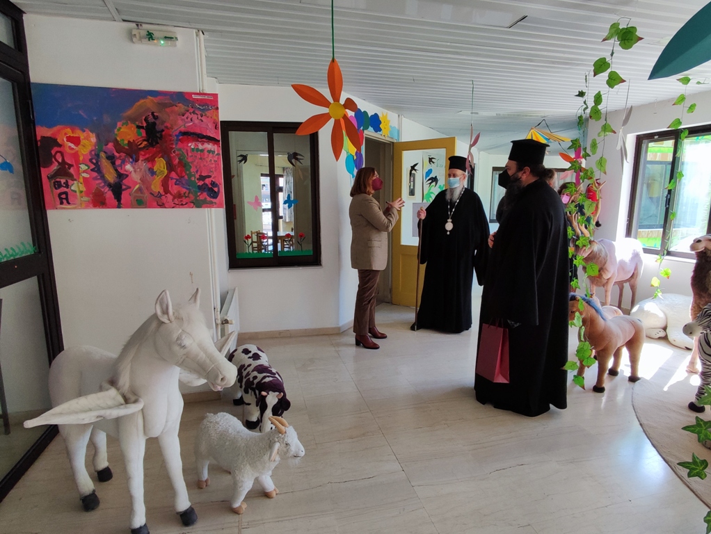 Ακολούθως, ύστερα από πρόσκληση, επισκέφθηκε και ευλόγησε τις εγκαταστάσεις του Βρεφονηπιακού Σταθμού ΟΑΕΔ, όπου ξεναγήθηκε από την Διευθύντρια κ. Παρασκευή Ντούλια, η οποία εξέφρασε την χαρά της για την επίσκεψη του Μητροπολίτου και του προσέφερε, ως αναμνηστικό, έναν πίνακα με καλλιτεχνικές δημιουργίες των μικρών παιδιών.