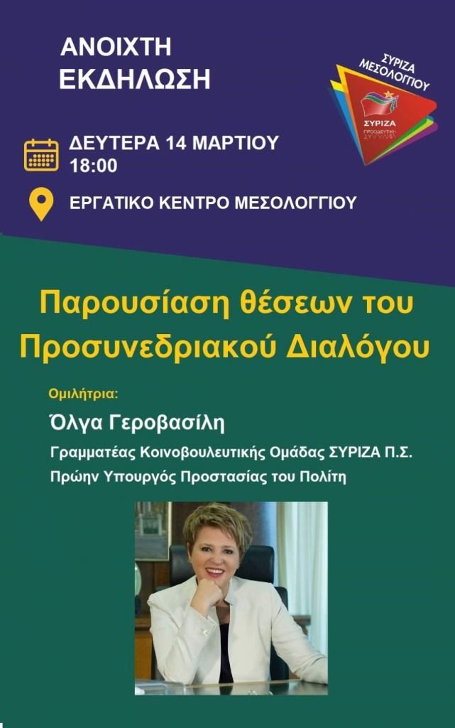 Στα πλαίσια του προσυνεδριακού διαλόγου, την Δευτέρα 14 Μαρτίου και ώρα 18:00, θα πραγματοποιηθεί Ανοιχτή Συνέλευση της Οργάνωση Μελών ΣΥΡΙΖΑ Π.Σ. Μεσολογγίου στο Εργατικό Κέντρο Μεσολογγίου.