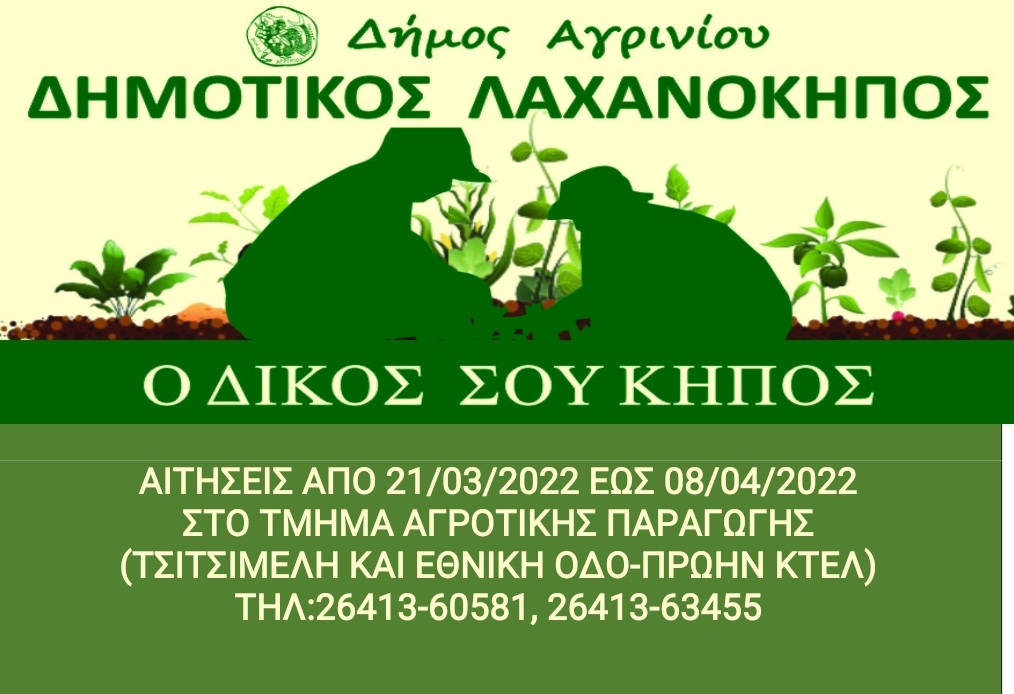 Οι δημότες που επιθυμούν να υποβάλουν αίτηση παραχώρησης κηποτεμαχίου μπορούν να προσέρχονται στο Τμήμα Αγροτικής Παραγωγής της Δ/νσης Τοπικής Οικονομικής Ανάπτυξης από 21-03-2022 έως 08-04-2020, εργάσιμες ημέρες και ώρες, στην οδό Τσιτσιμελή και Εθνική οδό (πρώην ΚΤΕΛ Αγρινίου) στον 1ο όροφο.