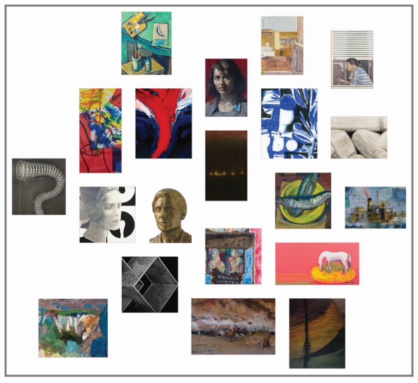 Πιο συγκεκριμένα θα εκτίθενται έργα των: Γιάννη Αδαμάκη, Τζούλιας Δημακοπούλου, Στέλλας Ανδρουλιδάκη, Άγγελου Αντωνόπουλου, Μάρκου Βενιού, Ανδρέα Βουρλούμη, Χρήστου Γαρουφαλή, Ειρήνης Γκόνου, Τζούλιας Δημακοπούλου, Θόδωρου Παπαδημητρίου, Χρήστου Καρά, Θεόφιλου Κατσιπάνου, Δημοσθένη Κοκκινίδη, Λήδας Κοντογιαννοπούλου, Γιάννη Κόττη, Σπύρου Κουρσάρη, Δημήτρη Κουτσιαύτη, Δημήτρη Κρέτση, Θανάση Μακρή, Χριστίνας Μόραλη, Γιάννη Μόραλη, Χρήστου Μποκόρου, Κώστα Πανιάρα, Μίλτου Παντελιά, Ασπασίας Παπαδοπεράκη, Βασίλη Παπανικολάου, Ηλία Παπανικολάου, Κώστα Παπανικολάου, Δημήτρη Παπατρέχα, Βασίλη Πέρρου, Μανώλη Πολυμέρη, Γιώργου Ρόρρη, Παύλου Σάμιου, Χριστίνας Σαραντοπούλου, Νάντιας Σκορδοπούλου, Σωτήρη Σόρογκα, Παναγιώτη Τέτση και Γιάννη Ψυχοπαίδη.