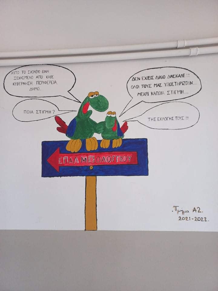 Οι μαθητές του ΕΠΑΛ Ι.Π. Μεσολογγίου μέσω του συγκεκριμένου γκράφιτι, μιλούν για την ωμή πραγματικότητα που ισχύει στη σημερινή σχολική κοινότητα της Ελλάδας γενικά και όχι μόνο σε τοπικό επίπεδο.