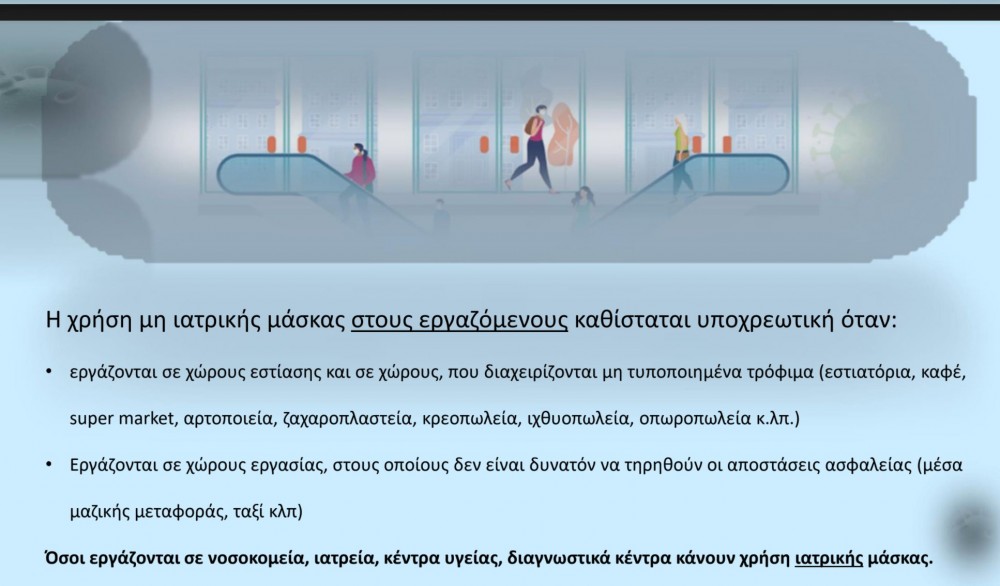 Η χρήση μη ιατρικής μάσκας στους εργαζόμενους καθίσταται υποχρεωτική όταν εργάζονται σε σούπερ μάρκετ χώρους εστίασης χώρους διαχείρισης μη τυποποημένων τροφίμων (κρεοπωλεία ιχθυοπωλεία, ζαχαροπλαστεία κ.α.) και σε οσους εργάζονται σε χώρους εργασίας στους οποίους δεν είναι δυνατόν να τηρηθούν οι αποστάσεις ασφαλείας (π.χ. μέσα μαζικής μεταφοράς). Όσοι εργάζονται σε νοσοκομεία ιατρεία κέντρα υγείας και διαγνωστικά κέντρα κάνουν χρήση ιατρικής μάσκας.