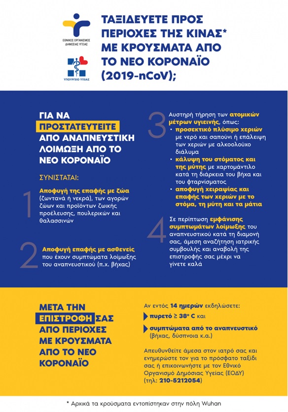 -Αν παρουσιάζουμε συμπτώματα πυρετού, βήχα ή δυσκολίας στην αναπνοή και έχουμε ταξιδιωτικό ιστορικό σε πληττόμενη περιοχή, επικοινωνούμε με το γιατρό μας ή με τον ΕΟΔΥ (τηλ. 2105212054) και παραμένουμε σπίτι μας.