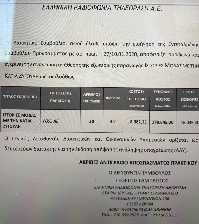 Όπως αναγράφεται στη σύμβαση, η εκπομπή αποτελείται από συνολικά 20 επεισόδια με το καθένα από αυτά να διαρκεί 45′ και να κοστίζει 8.982 ευρώ+ ΦΠΑ. Το συνολικό κόστος της παραγωγής της ανέρχεται στα 179.645 ευρώ.