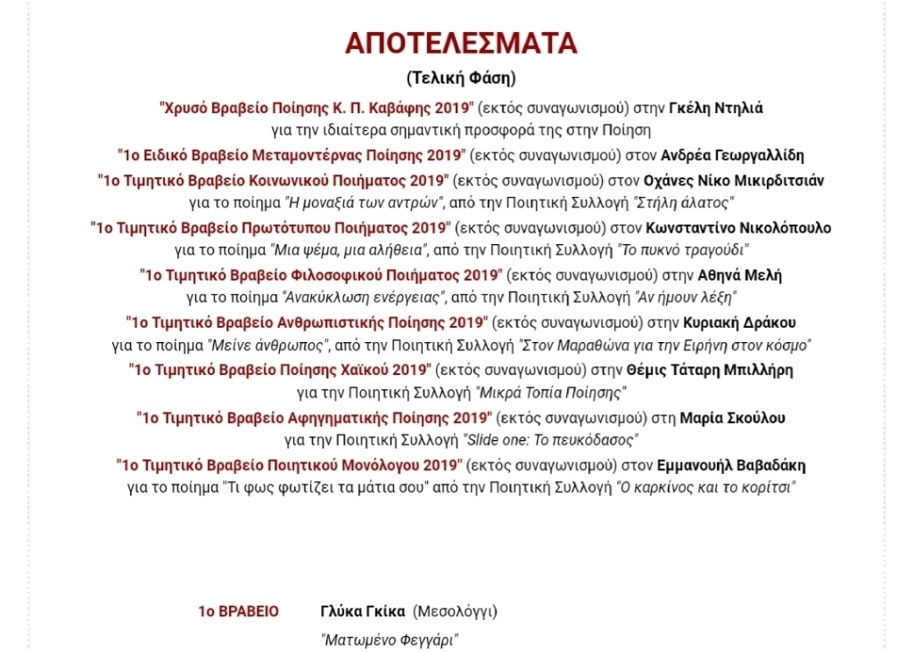 Τιμητική διάκριση για την Γλύκα Γκίκα στον 5ο Παγκόσμιο Διαγωνισμό Ποίησης "Κ. Π. Καβάφης" 2019 .