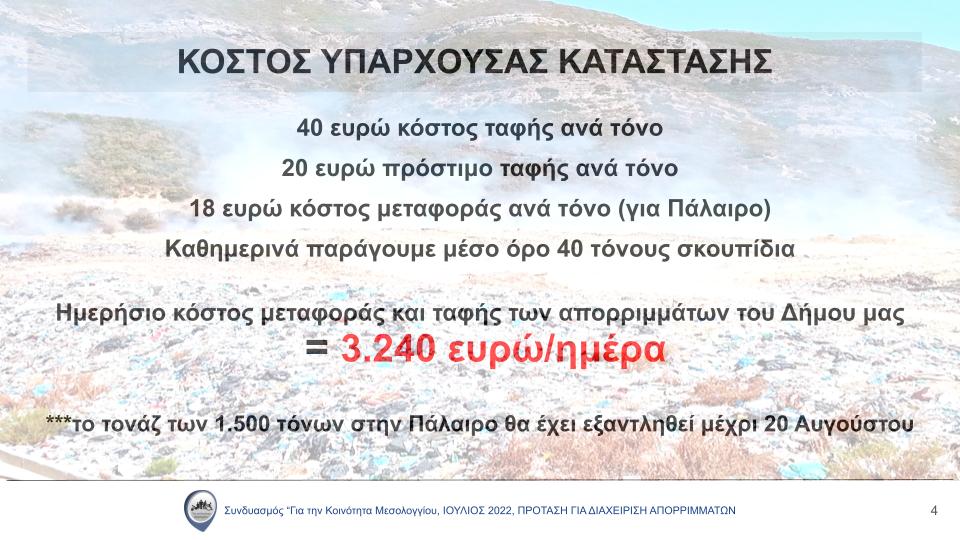 Αυτή την στιγμή ο Δήμος μας δαπανά την ημέρα, το ποσό των 3.240 ευρώ για να μεταφερθούν και να ταφούν τα σκουπίδια μας στην Πάλαιρο. Το ποσό αυτό αναλύεται ως εξής: η ημερήσια παραγωγή απορριμμάτων είναι 40 τόνοι και το κόστος ταφής είναι 40 ευρώ/τόνο, το πρόστιμο ταφής 20 ευρώ/τόνο και το κόστος μεταφοράς στην Πάλαιρο 18 ευρώ/τόνο.