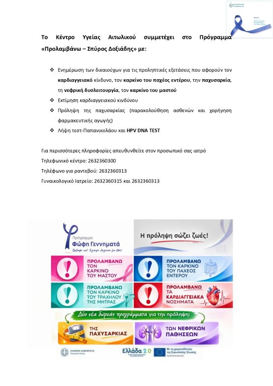 Το Κέντρο Υγείας Αιτωλικού συμμετέχει στο πρόγραμμα "Προλαμβάνω-Σπύρος Δοξιάδης"