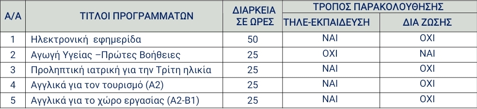 Στο Κ.Δ.Β.Μ. του Δήμου Αγρινίου μπορούν να δημιουργηθούν τμήματα σύμφωνα με τον πίνακα που ακολουθεί: